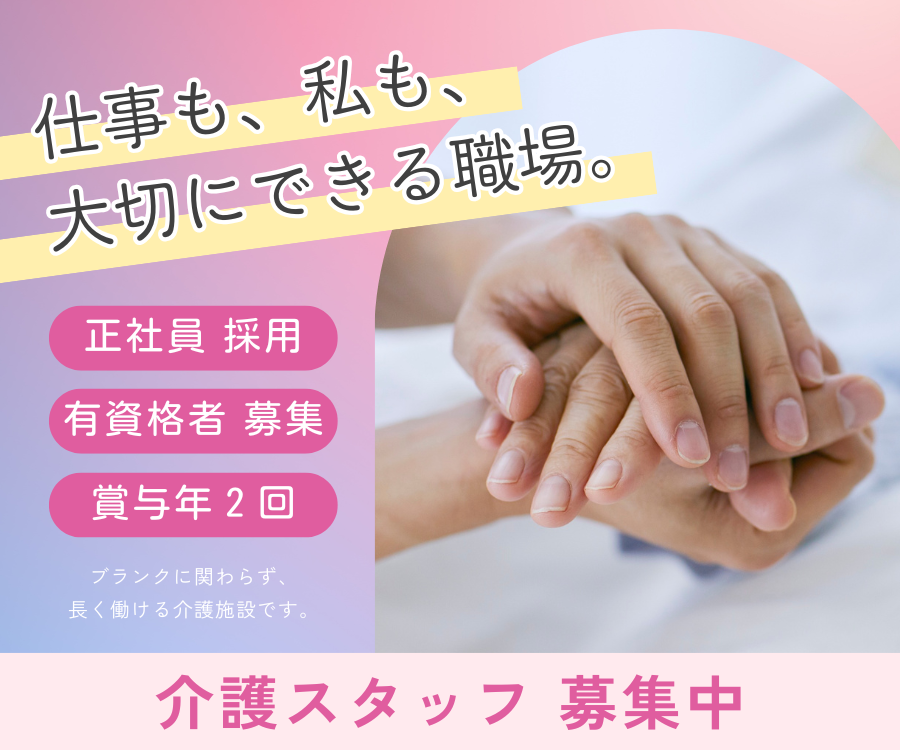 | コンサルタントから一言 | 最後までご覧いただきありがとうございます。 ★「ちょっと気になる…」と思ったら、 まずは「求人に応募」をクリック! 応募したら必ず面接に行かなければいけない ということはありません! ・昇給や残業など、本当はどうなのか知りたい ・どんな人が採用されたのか知りたい 求人詳細について気になる点がございましたら お気軽にお問い合わせください♪ 三幸福祉カレッジを運営する(株)日本教育クリエイトの 介護職専門就職アドバイザーが、 お仕事決定までトータルサポート。 就職・転職支援は、完全無料です! あなたの「納得」を一緒に実現しましょう。 ご応募お待ちしています☆ |