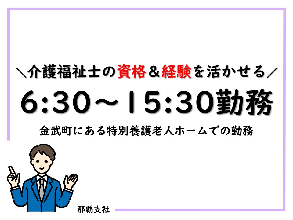 金武町字伊芸にある特養での介護職業務 ・起床の手伝い ・食事介助 ・入浴介助 ・排泄介助 ・移動移乗のサポート |