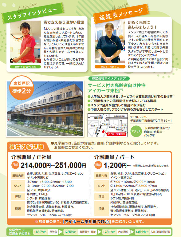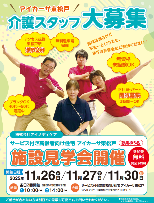 【施設見学会 開催】経験ゼロから始められるサ高住『アイカーサ東松戸』千葉県松戸市★介護スタッフ大募集