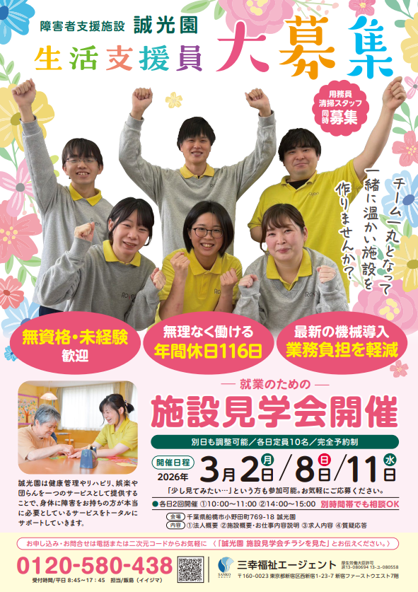 【施設見学会 開催】『障害者支援施設 誠光園』千葉県船橋市★生活支援員・清掃員・用務員 大募集!