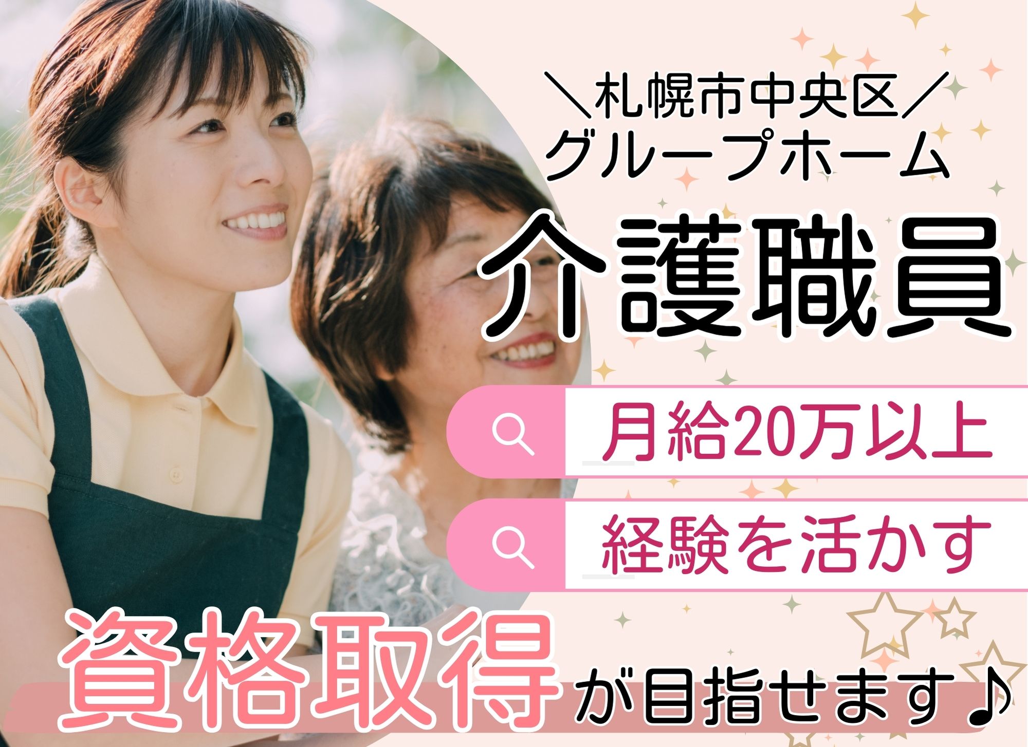 介護職,介護事務,介護,初任者研修,実務者研修,介護福祉士,賞与,正社員,派遣社員,北海道,札幌市,中央区,北区,手稲区,有料老人ホーム,老人保健施設,特別養護老人ホーム,サービス付き高齢者向け住宅,グループホーム,小規模多機能型居宅介護,ショートステイ,デイサービス,デイケアサービス,訪問介護,転職,就職,福利厚生充実,お仕事見学会,お仕事相談会,お仕事説明会