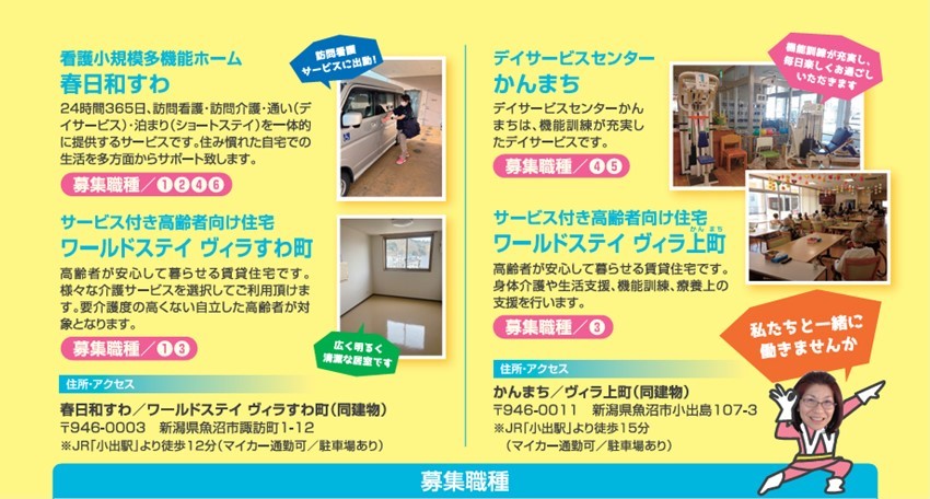 施設名: 『看護小規模多機能ホーム 春日和すわ』『サービス付き高齢者向け住宅 ワールドステイ ヴィラすわ町』