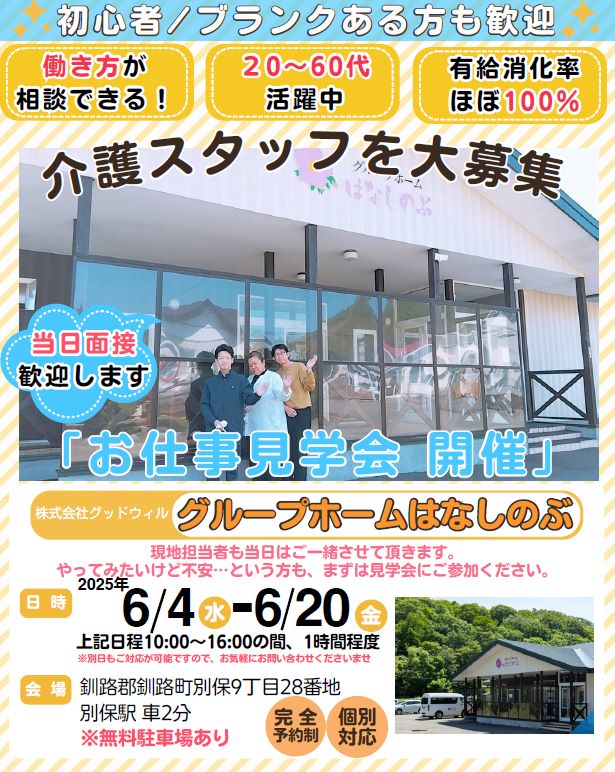 【釧路町】グループホームはなしのぶ|個別見学会開催|正社員|パート|介護職員大募集