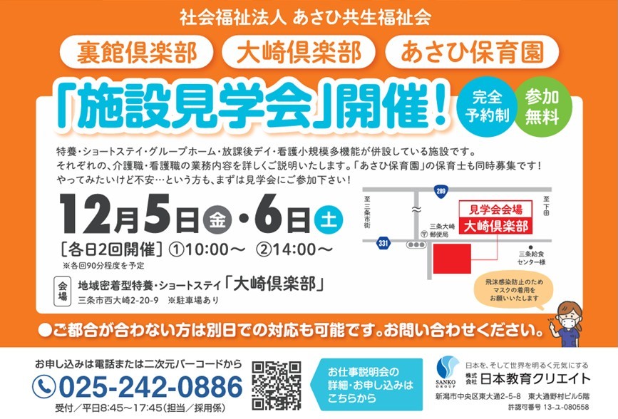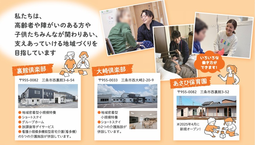 【三条市】あさひ共生福祉会の3施設で施設見学会を開催|裏館倶楽部|大崎倶楽部|あさひ保育園|介護職員・看護師・保育士スタッフ募集!