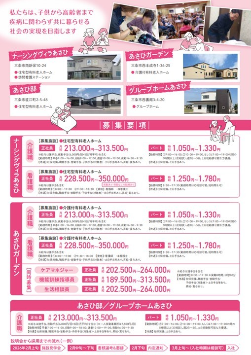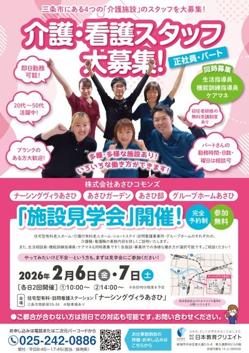 【三条市】あさひコモンズの4施設で施設見学会を開催|ナーシングヴィラあさひ・あさひガーデン・あさひ邸・グループホームあさひ|介護職員・看護師・専門職スタッフ募集!