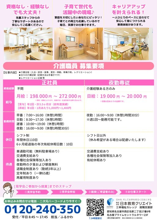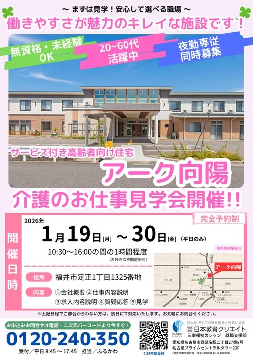 【福井市定正】アーク向陽|施設見学会開催|1/19~31より選択可|正社員・夜勤専従|介護職員