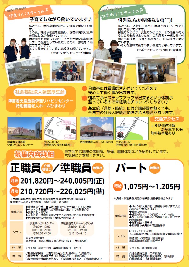 【伊達市】特別養護老人ホーム|障がい者福祉施設|お仕事見学会開催|正職員|準職員|パート|無資格|介護福祉士