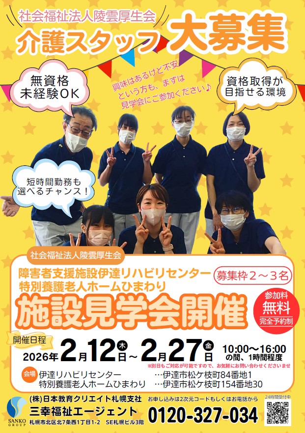 #北海道#伊達市#特別養護老人ホーム#障がい者支援施設#キャリアアップ#お仕事見学会#説明会#正社員#20代#30代#40代#50代#無資格#介護職員初任者研修#ホームヘルパー2級#介護職員実務者研修#ホームヘルパー1級#介護福祉士#福祉#介護#ケアマネージャー#生活相談員#仕事#社会奉仕#生活支援#サポート#介助#世話#介護スタッフ#就職活動#転職活動#ブランクあり歓迎#人間関係#働きがいのある仕事#人や社会の役に立てる#今後ニーズの高まる仕事#仕事#求人#体験#見学#無料#服装自由#ハローワーク#三幸#三幸福祉カレッジ#グループホーム#三幸福祉エージェント