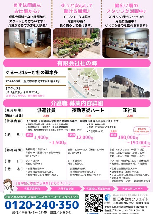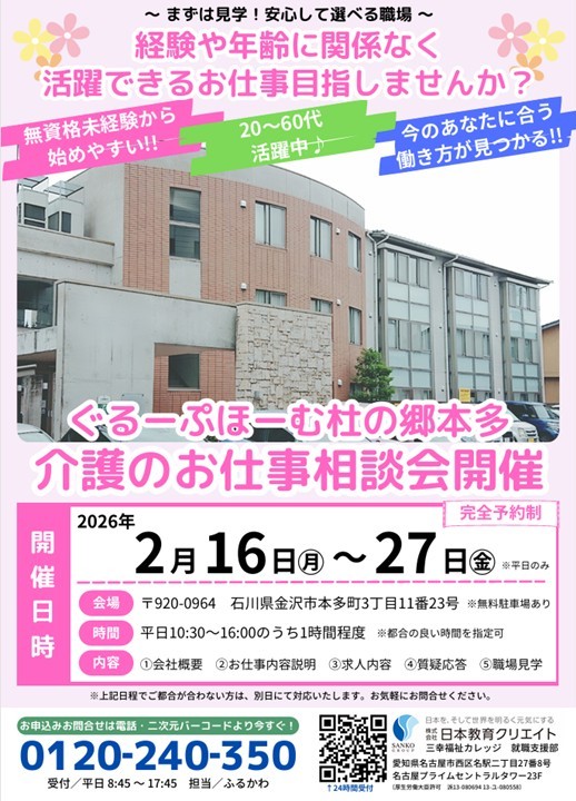 【金沢市本多町】ぐるーぷほーむ杜の郷本多にて介護のお仕事相談会開催|正社員・派遣・夜勤専従|介護職員募集!