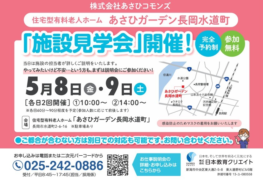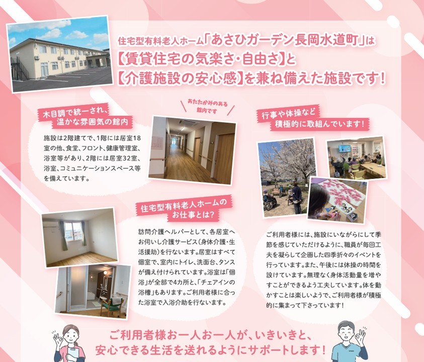 【長岡市水道町】住宅型有料老人ホーム「あさひガーデン長岡水道町」の施設見学会を開催|介護職員・看護職員|正社員&パート募集!